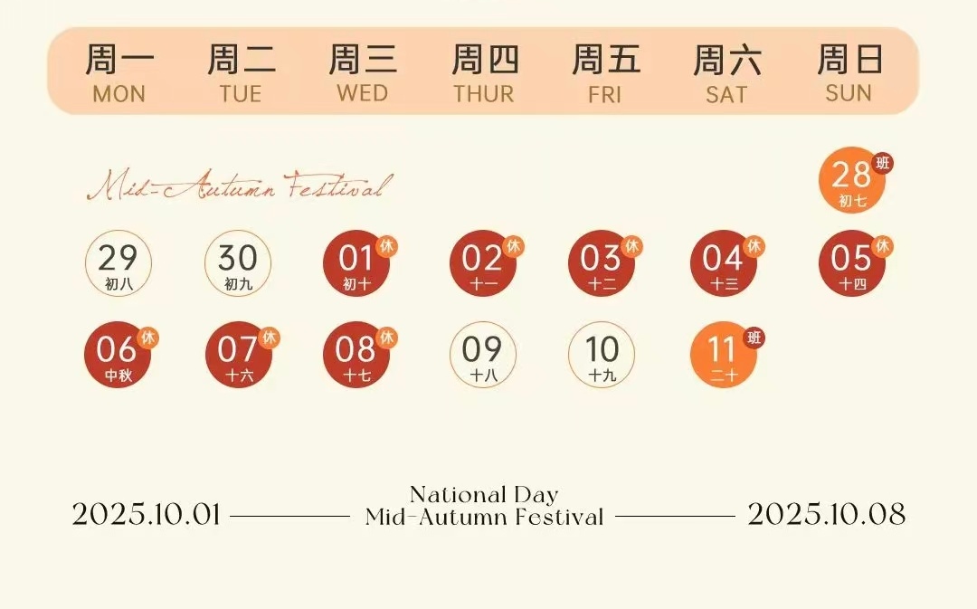 À medida que o Festival do Meio do Outono e os feriados do Dia Nacional se aproximam, gostaríamos de aproveitar esta oportunidade para estender nossos mais calorosos cumprimentos e votos a você e sua família.